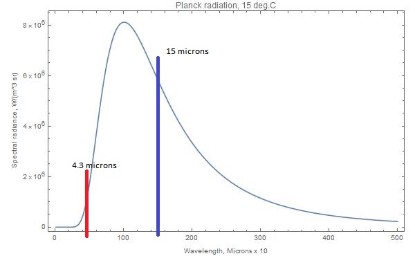 Professor W.J.Witteman [Ref. 1] provides a detailed account of the absorption of thermal emission from the Earth surface by atmospheric CO2. He found that at atmospheric temperatures only a few low-lying vibrational bands of CO2 are relevant. Further, it stated that “Especially the absorbed radiation power by the ground state bending mode at about 15 microns is dominant.” The Conclusion states “The absorption of thermal emission from the earth by CO2 occurs at wavelengths around 15, 5 and 4.3 microns.”