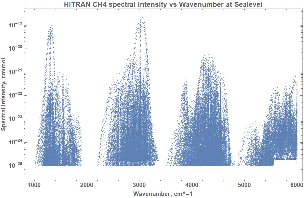 for a total energy density of 4.303 x 10^-7 J/cu.m. from the Sun, absorbed by the atmospheric CH4 compared to 3.692 x 10^-7 J/cu.m. from the Earth’s surface. Consequently, if there was a greenhouse effect it would cause the Earth to cool as the concentration of atmospheric CH4 increased due to an increase in the amount of the Sun’s radiation emitted back into space before it could warm the Earth, as is the case for atmospheric CO2.