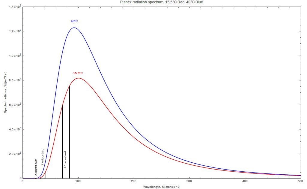 giving a total photon density of 1.38 x 10+13 photons per cu. m. of which the 7.5 micron band dominates with 98.85% of the total. The energy density for all wavelengths from a source at 288.5̊K is 5.241 x 10^-6 Joules per cubic metre of which 7.044% (3.692 x 10-7 J/cu. m) is in the above-chosen CH4 absorption bands. Figure 2 illustrates the Planck spectrum for a source at 15.5̊C, the estimated average Earth surface temperature, with the three main absorption bands for CH4 marked, plus the spectrum for a source at 40̊C.