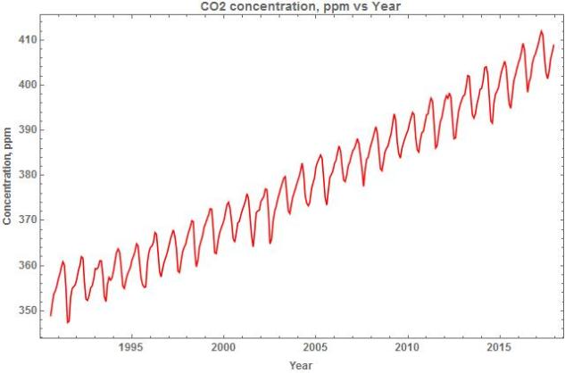 The Oceanic Niño Index consists of monthly anomaly values from a three month running average of the sea surface temperature departures from the 30 year base temperature over an area of the central Pacific Ocean bounded by 5°S to 5°N latitudes and 120°W to 170°W longitudes, the Niño 3.4 region. The data is provided by the US National Oceanic and Atmospheric Administration as part of its prediction service for El Niño events and covered the period January 1950 to October 2018 [ Ref. 9 ]. A subset, January 1990 to December 2017, was used for a comparison with the annual rate of change of the CO2 concentration.