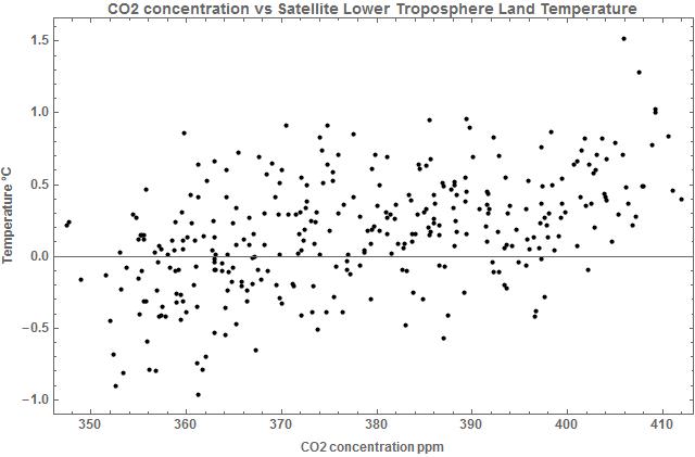 The Pearson correlation coefficient between the detrended CO2 concentration and the detrended satellite land temperature was 0.054 with a probability of 33% from the test for zero correlation. The correlation between the detrended CO2 concentration and the detrended satellite land temperature is shown in Figure 4.