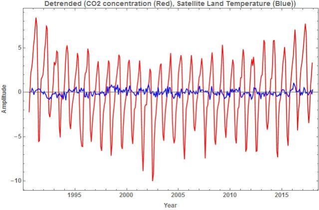The Pearson correlation coefficient between the detrended seasonal averaged CO2 concentration and the detrended satellite land temperature was -0.068. The test for zero correlation gave a Spearman Rank statistic of -0.096 with 9% probability, that is, it is possible that increased CO2 concentration related to decreased temperature. The marked difference in correlation coefficient and probability between the measured time series before and after detrending is attributed to the positive linear trend apparent in each of the series. As a linear trend can be fitted to any time series, correlation between two such series is not necessarily an indication of causation.