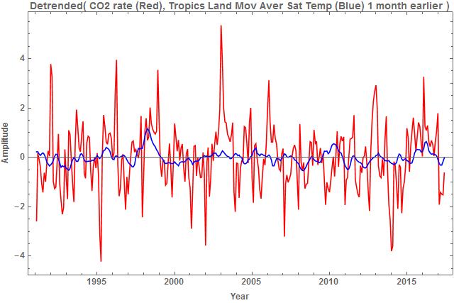 Another method of removing the seasonal effect was to create a time series of the annual rate of change of the CO2 concentration by taking differences 12 months apart. The Pearson correlation coefficient for the pair of detrended time series, satellite land temperature and the annual rate of change of the CO2 concentration, was 0.10 with a zero correlation probability of 0.07 indicating that the series were not independent. This is markedly different to the lack of correlation shown above between the detrended pair of seasonal averaged CO2 concentration and satellite land temperature suggesting that temperature may directly or indirectly determine the CO2 rate of change.